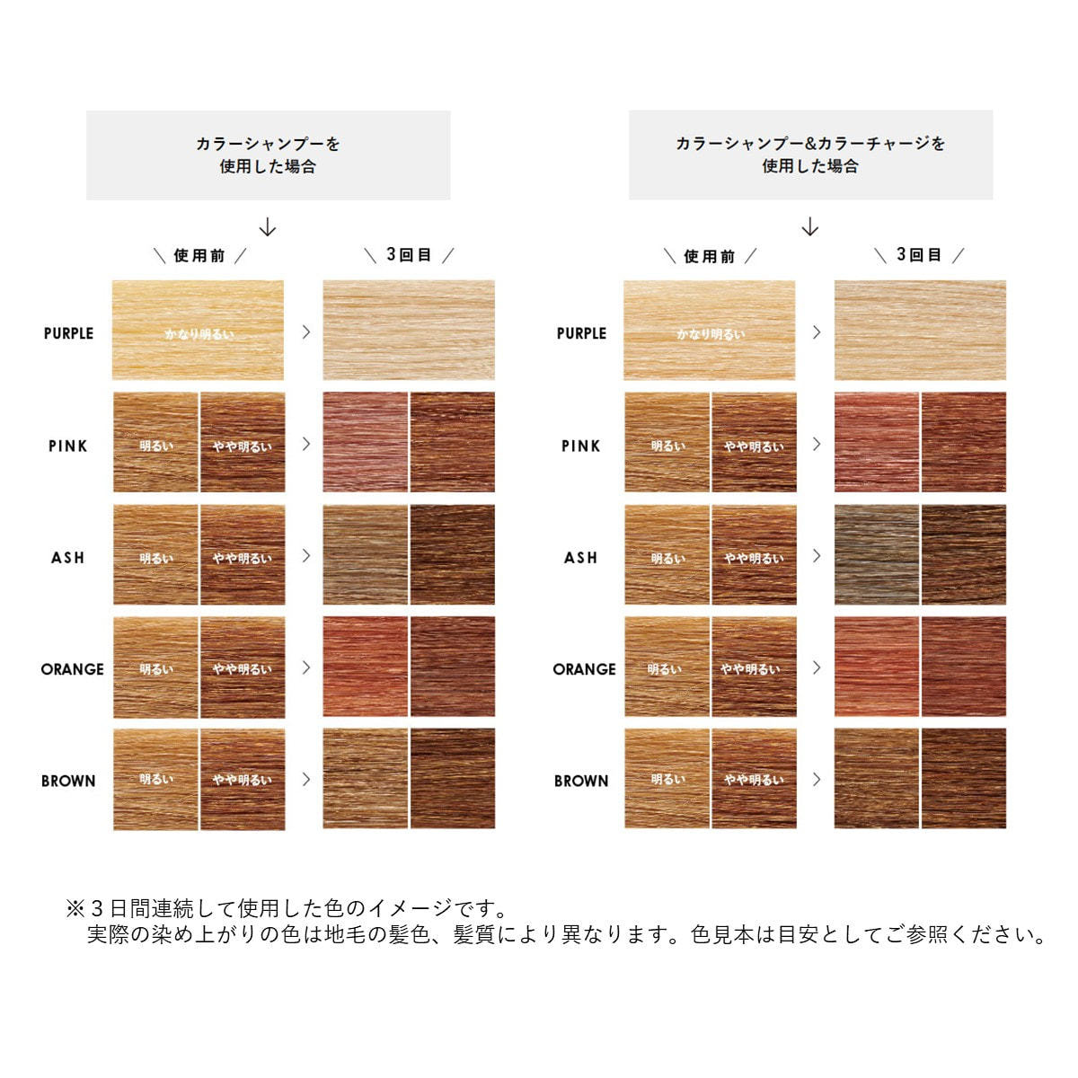 5つのカラーから選べるカラーシャンプー&カラーチャージ(トリートメント)のダブル使いで、サロンカラーにさらに色をチャージ。