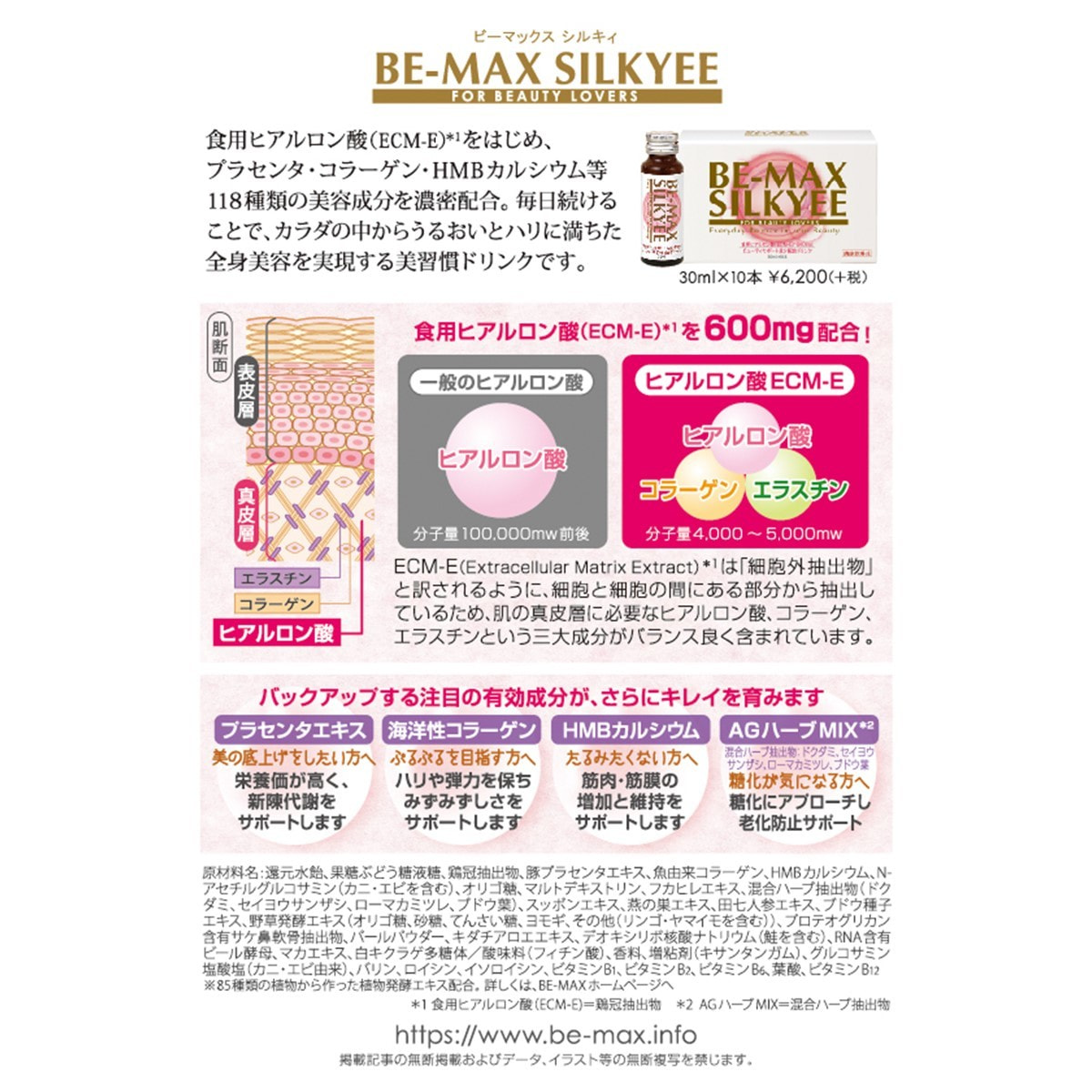 食用ヒアルロン酸「ECM-E」は1日当たり100~120mgの摂取が効果的と言われてますが、BE-MAX SILKYEEにはその約6倍の600mgを配合。