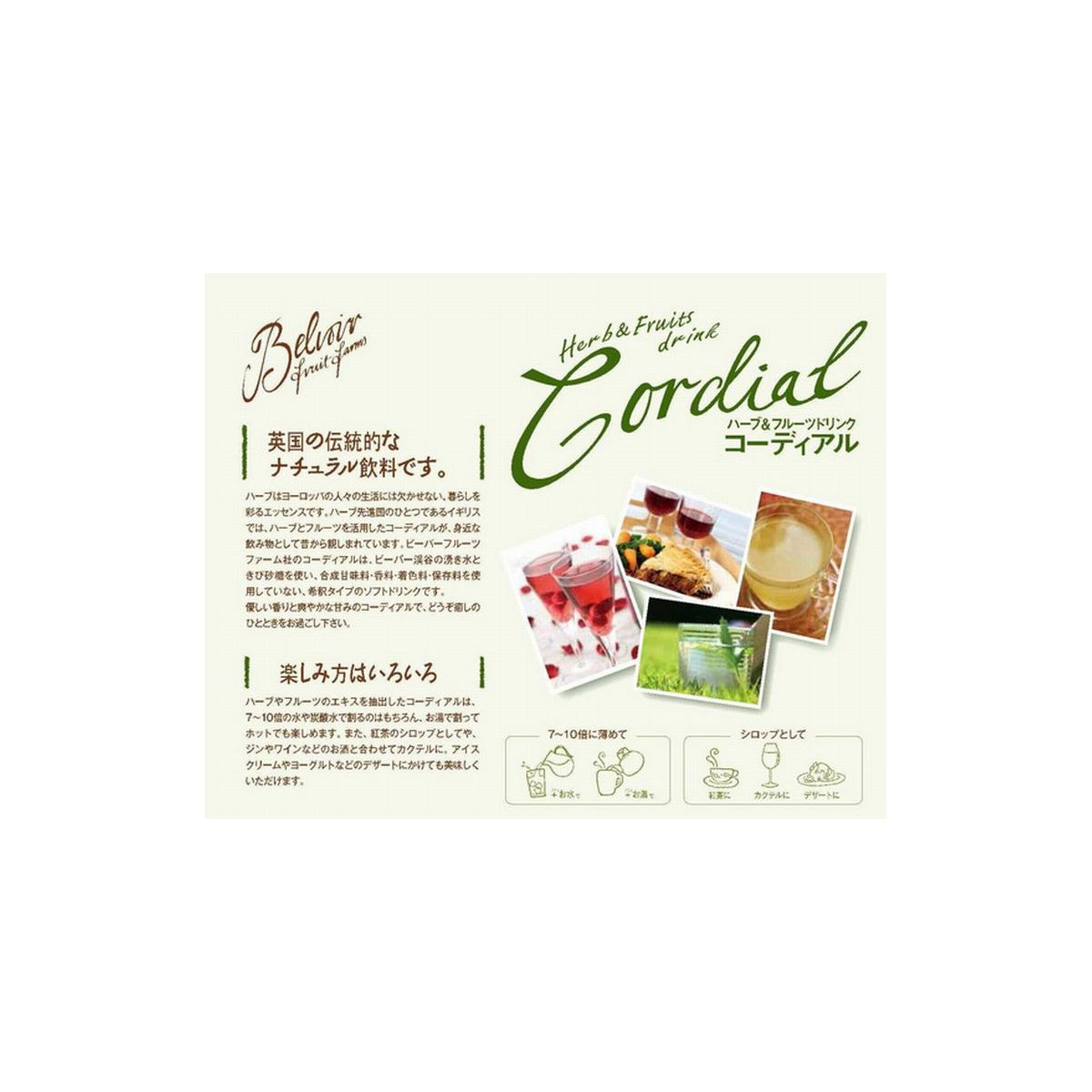 ビーバーフルーツファーム社のコーディアルは、ビーバー渓谷の湧き水ときび砂糖を使い、甘味料・香料・着色料・保存料を一切使用していない希釈タイプ(10倍希釈)のソフトドリンクです。