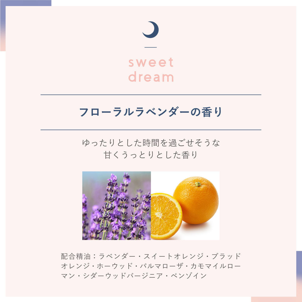 ・配合精油:ラベンダー・スイートオレンジ・ブラッドオレンジ・ホーウッド・パルマローザ・カモマイルローマン・シダーウッドバージニア・ベンゾイン
