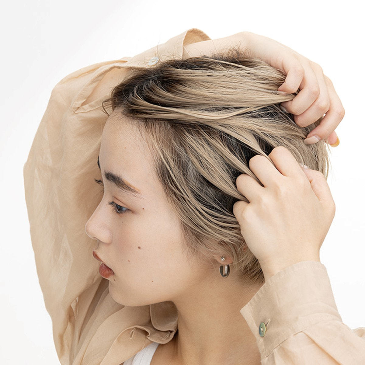 ①指の間までしっかりのばし、内側や襟足などボリュームを抑えたい部分にしっかり髪の内側からつけます。