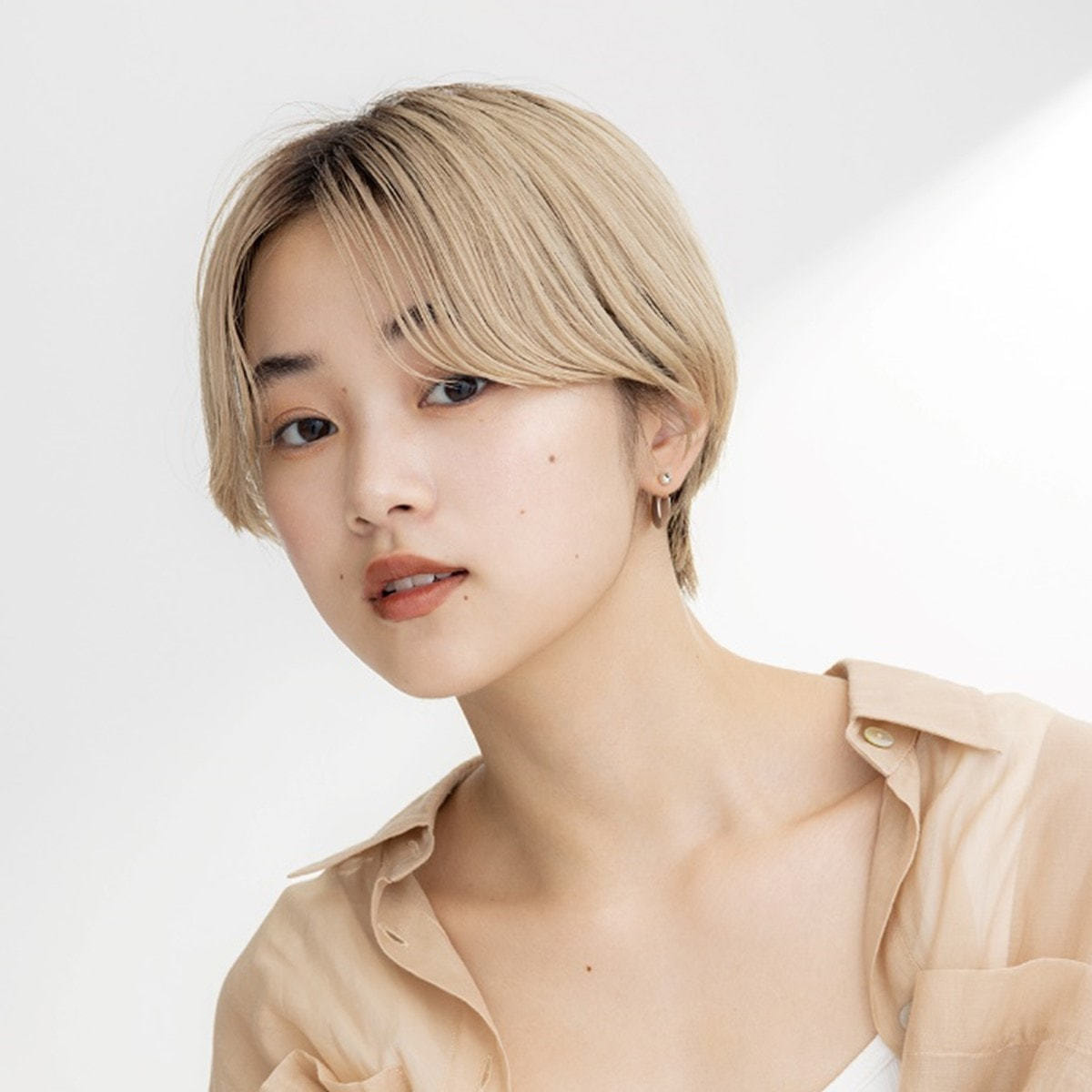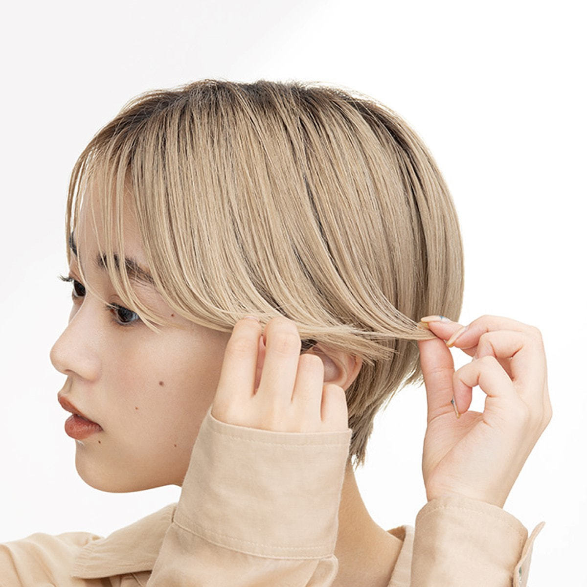 ②表面はつけすぎないよう、手に余った分を使います。毛先から5センチくらいまでの部分を指でつまみながらつけて毛流れを整えます。手に残った分はそのまま指になじませます。
