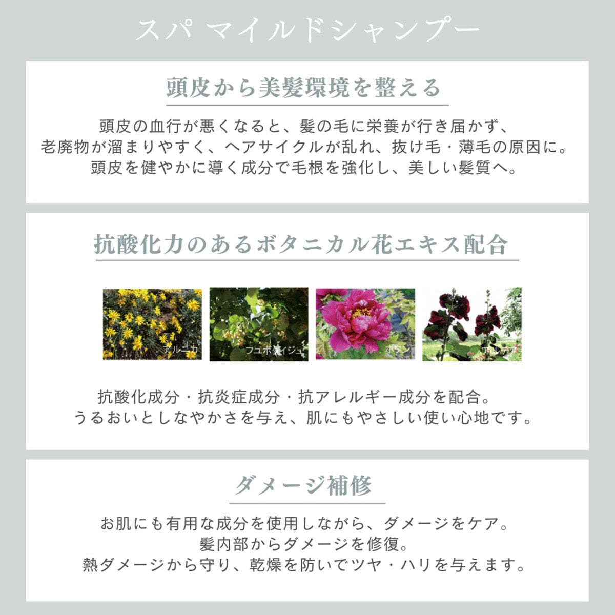 水、オレフィン(C14-16)スルホン酸Na、コカミドプロピルベタイン、BG、コカミドDEA、ジステアリン酸グリコール、PPG-5セテス-10リン酸、クレアチン、加水分解ゴマタンパクPGプロピルメチルシランジオール、アルニカ花エキス、フユボタイジュ花エキス、トゲキリンサイ/ヒヂリメン/ミツイシコンブ/ウスバアオノリ/ワカメエキス、ミツイシコンブ/ワカメエキス、ボタンエキス、アルテア根エキス、センブリエキス、ポリクオタ二ウム-64、グリチルリチン酸2K、オウゴン根エキス、グリコシルトレハロース、加水分解水添デンプン、(HDI/トリメチロールヘキシルラクトン)クロスポリマー、グアーヒドロキシプロピルトリモ二ウムクロリド、エチルヘキシルグリセリン、ペンテト酸5Na、ポリクオタ二ウム-7、シリカ、1,2-ヘキサンジオール、カプリリルグリコール、グレープフルーツ果皮油、オレンジ果皮油、ラベンダー油、ローズマリー葉油