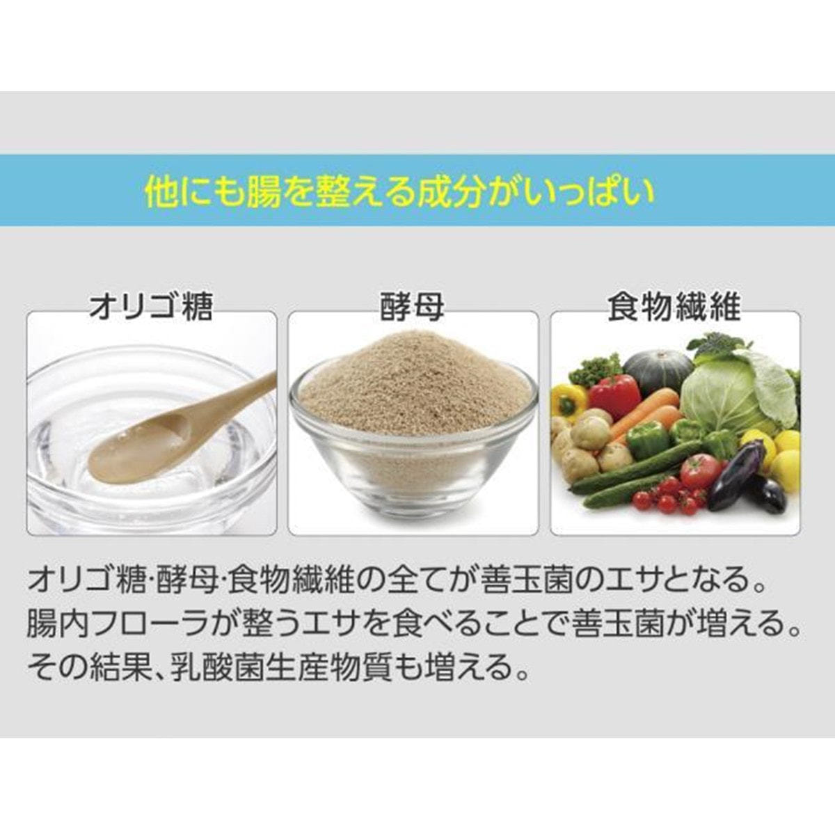 オリゴ糖・酵母・食物繊維が善玉菌のエサとなり、腸内フローラを整えます。