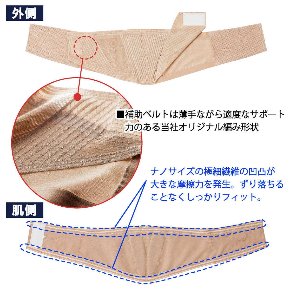 補助ベルトは薄手ながら適度なサポート力のある当社オリジナル編み形状。