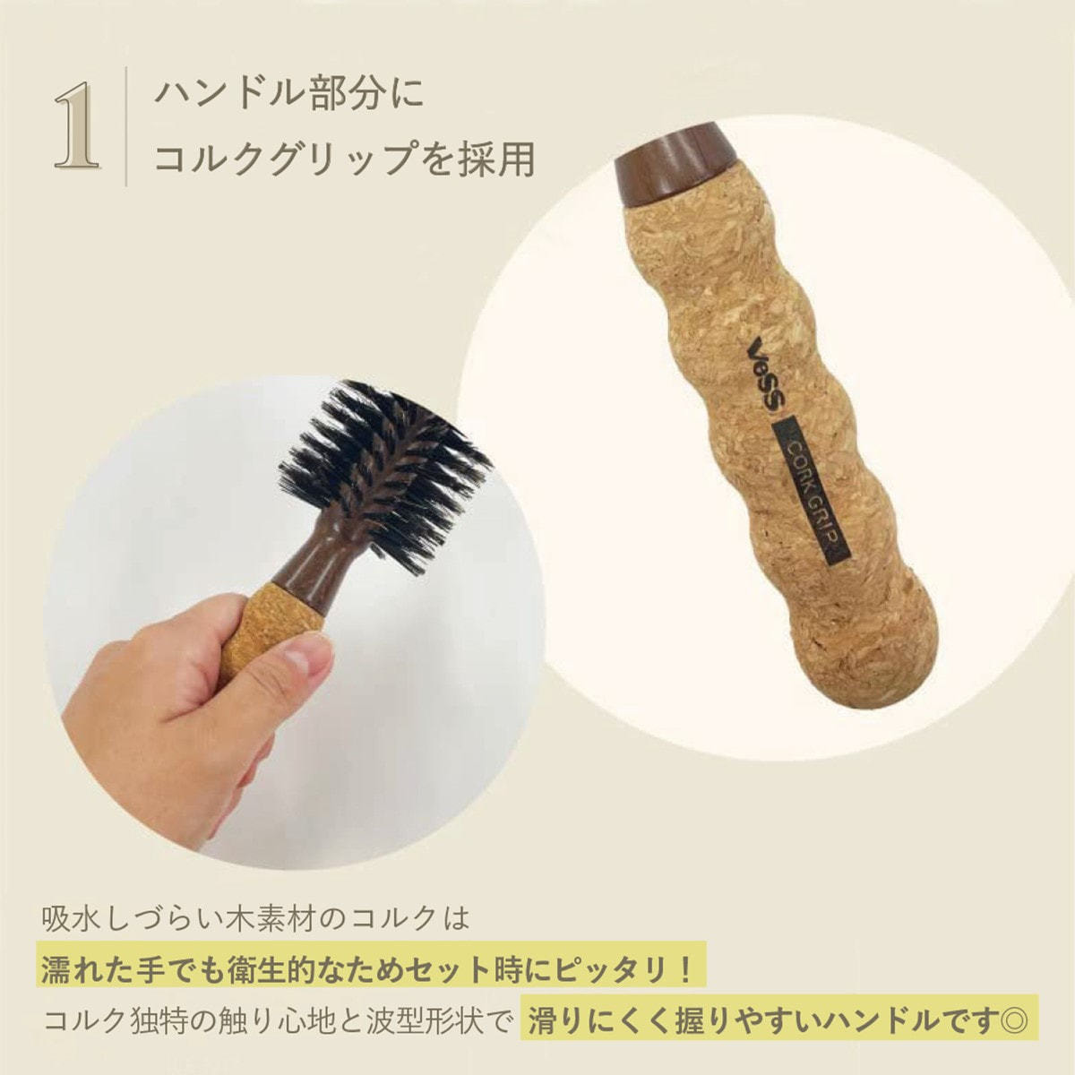 持ち手部分には濡れても吸水しにくく滑りにくいコルクグリップを採用。