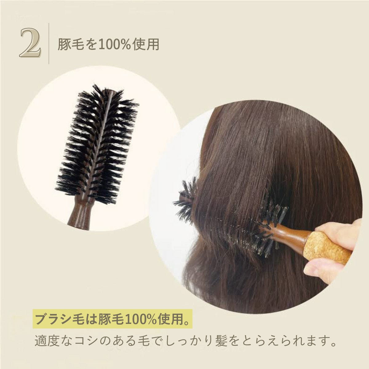 毛台には、硬くて粘りがあり曲げに強いブナ材を使用し、ブラシ毛は髪のつかみが良い毛丈にカットした豚毛(100%)を植毛したロール径60mmのロールブラシです。