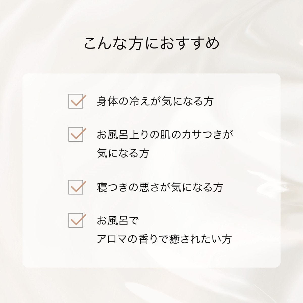 身体の冷えが気になる/寝つきが悪い/お風呂上がりの肌がかさつく/身体を労わりたい