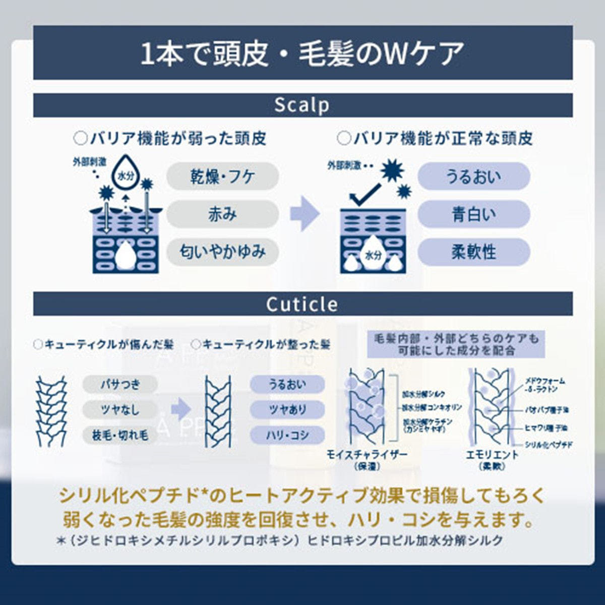 すこやかに導くスカルプケア成分配合で頭皮を乾燥から守り地肌を整える。