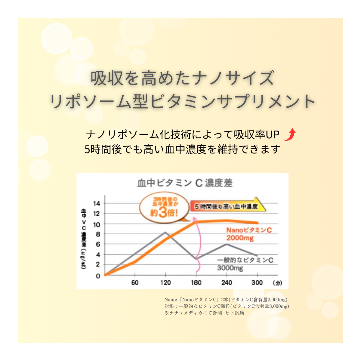 美容にも健康にも欠かせないビタミンCをリポソーム化&ナノサイズ化し、吸収率、持続力を高めました。