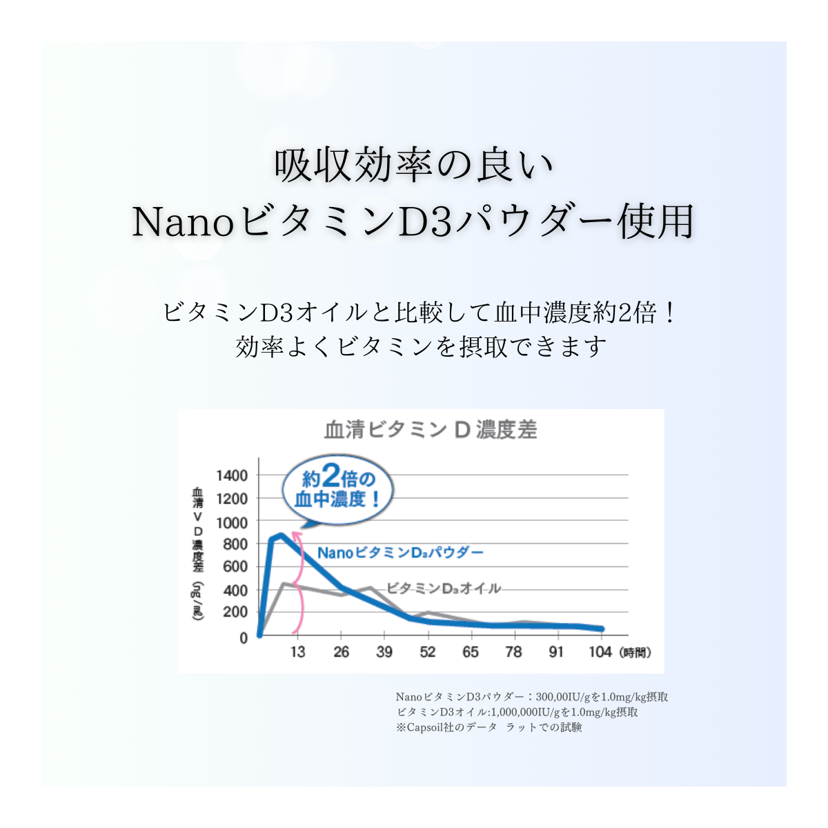 一度に摂ると吸収率が低下しやすいビタミンを、Capsoil(カプソイル)社の独自技術でナノメートルサイズのリポソーム原料に加工しました。