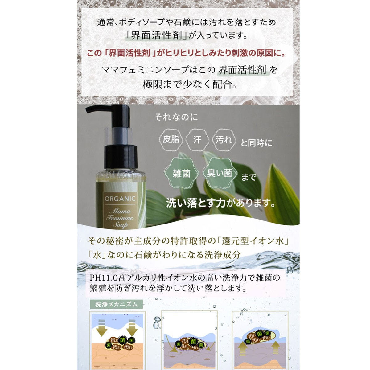 主成分となる「還元型イオン水」により、高い抗菌力・洗浄力・無刺激性が実現しました。