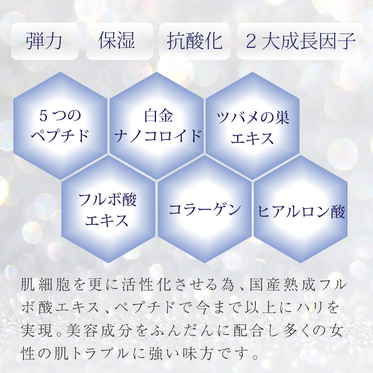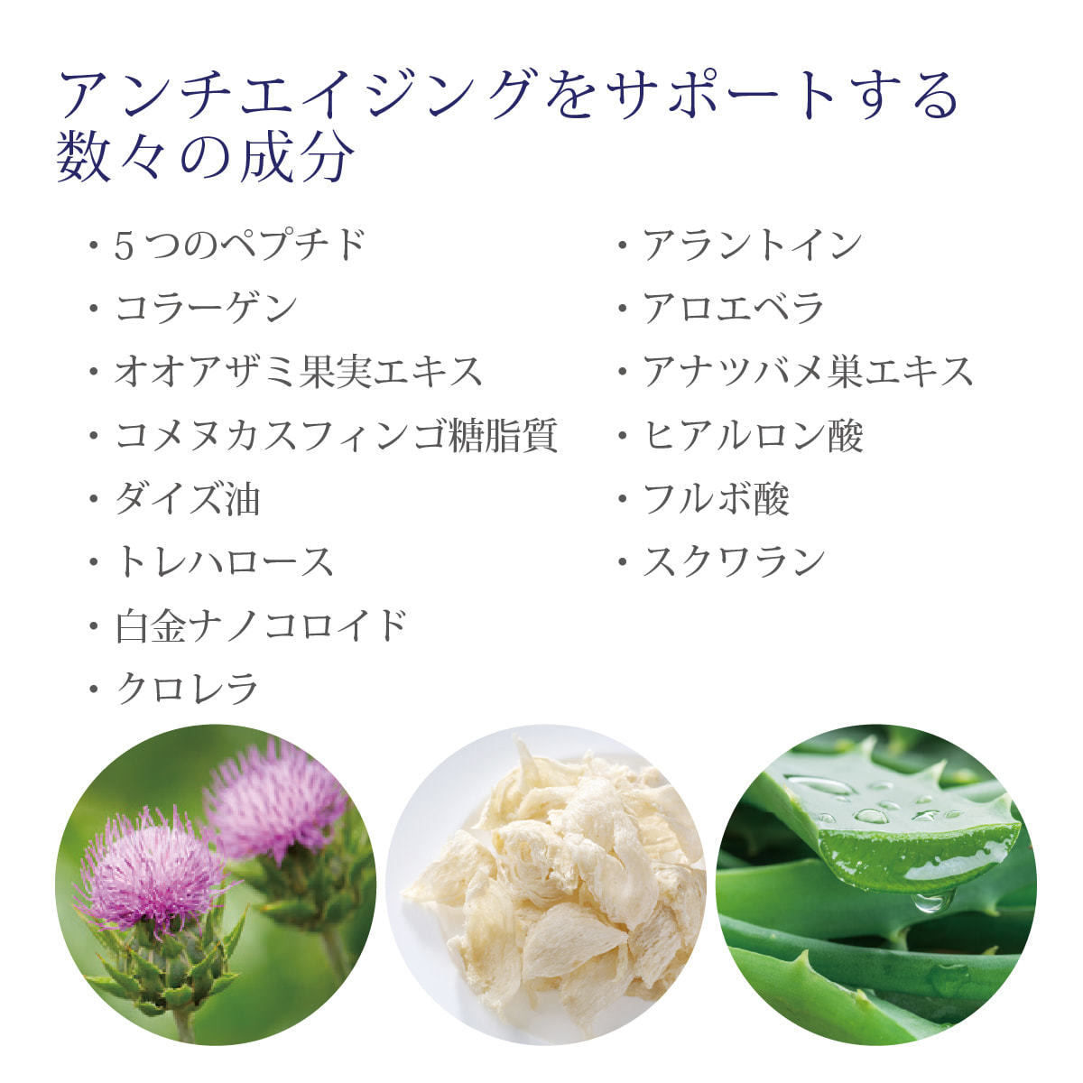 白金ナノコロイド、スクワラン、ツバメ巣エキス、ラーゲン、クズ根エキス、アロエベラ葉エキス、クロレラエキス、オオアザミ果実エキス、ヒアルロン酸、パルミトイルペンタペプチド-4、パルミトイルトリペプチド-38、ステパルミトイルジペプチド-5ジアミノブチロイルヒドロキシトレオニン、パルミトイルジペプチド-5ジアミノヒドロキシ酪酸、
