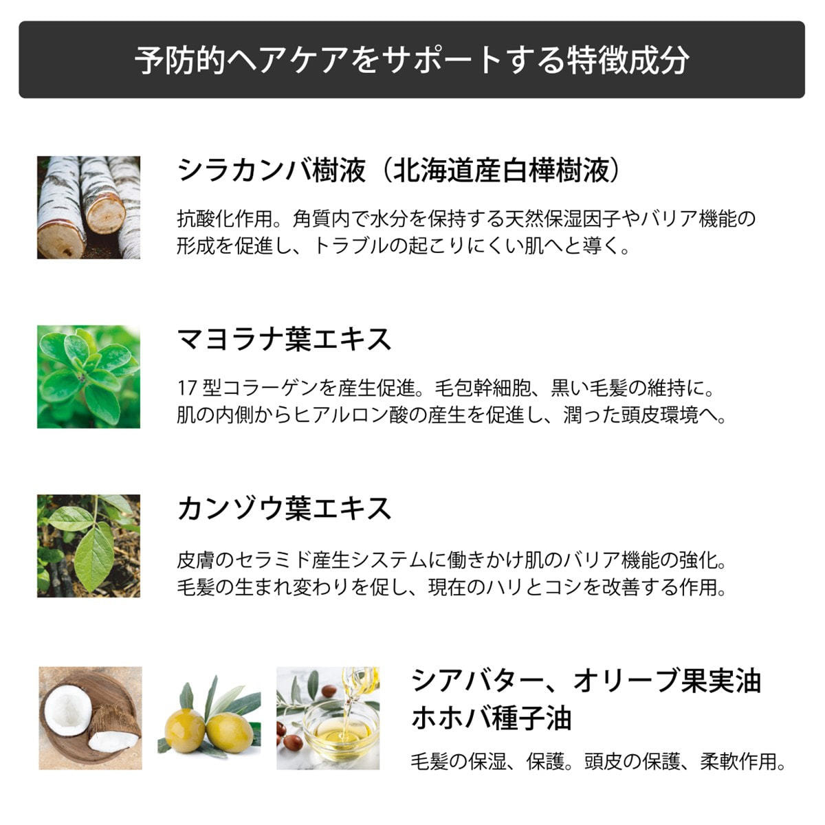 シラカンバ樹液(北海道産白樺樹液)、マヨラナ葉エキス、カンゾウ葉エキス、シアバター、オリーブ果実油、ホホバ種子油