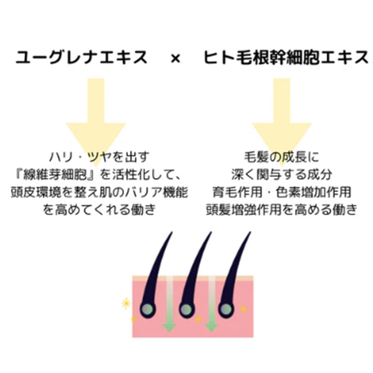 独自成分ユーグレナエキスと毛髪の成長に深く関与している有用成分のヒト毛根幹細胞エキスにより、頭皮環境を整えて健康な毛髪を育みます。