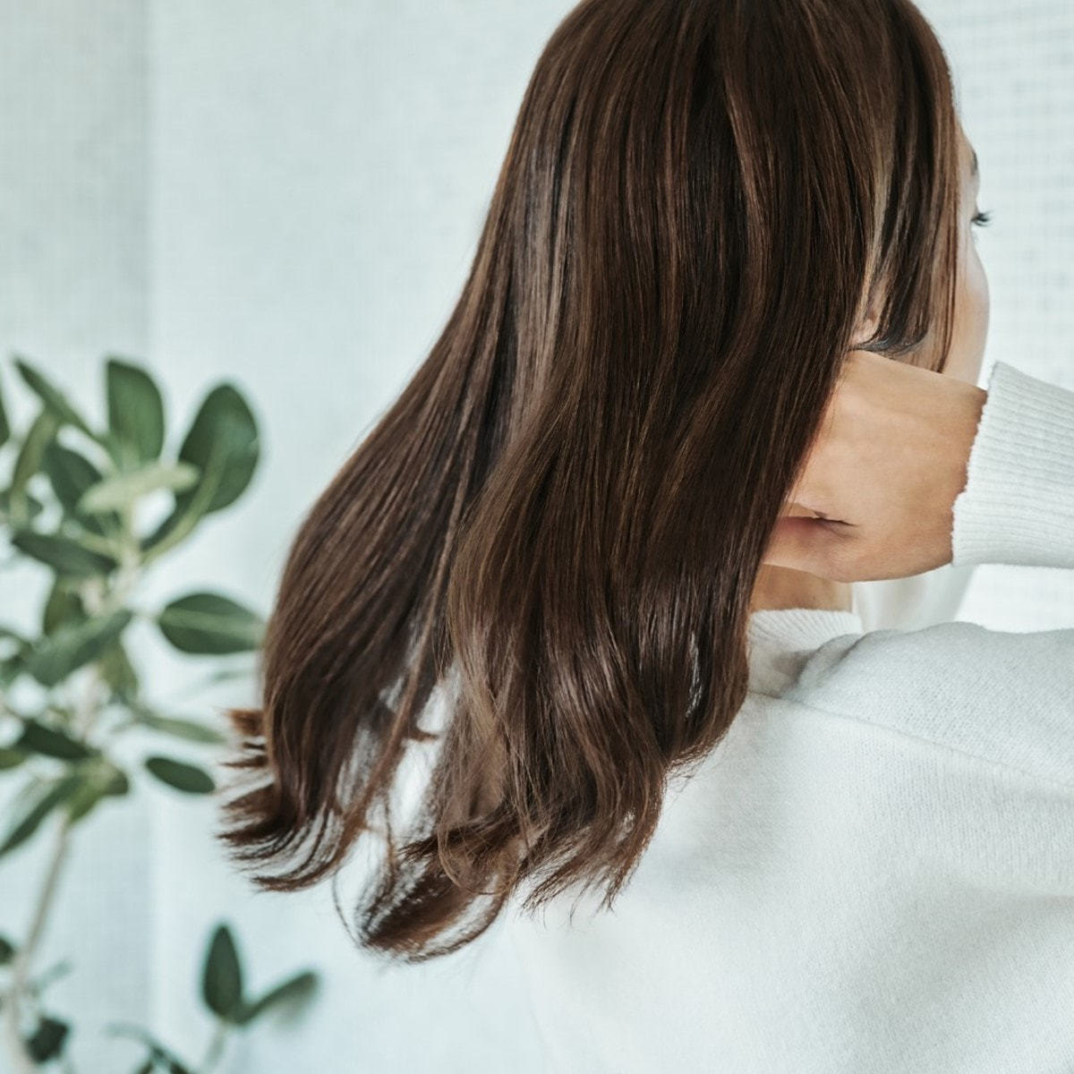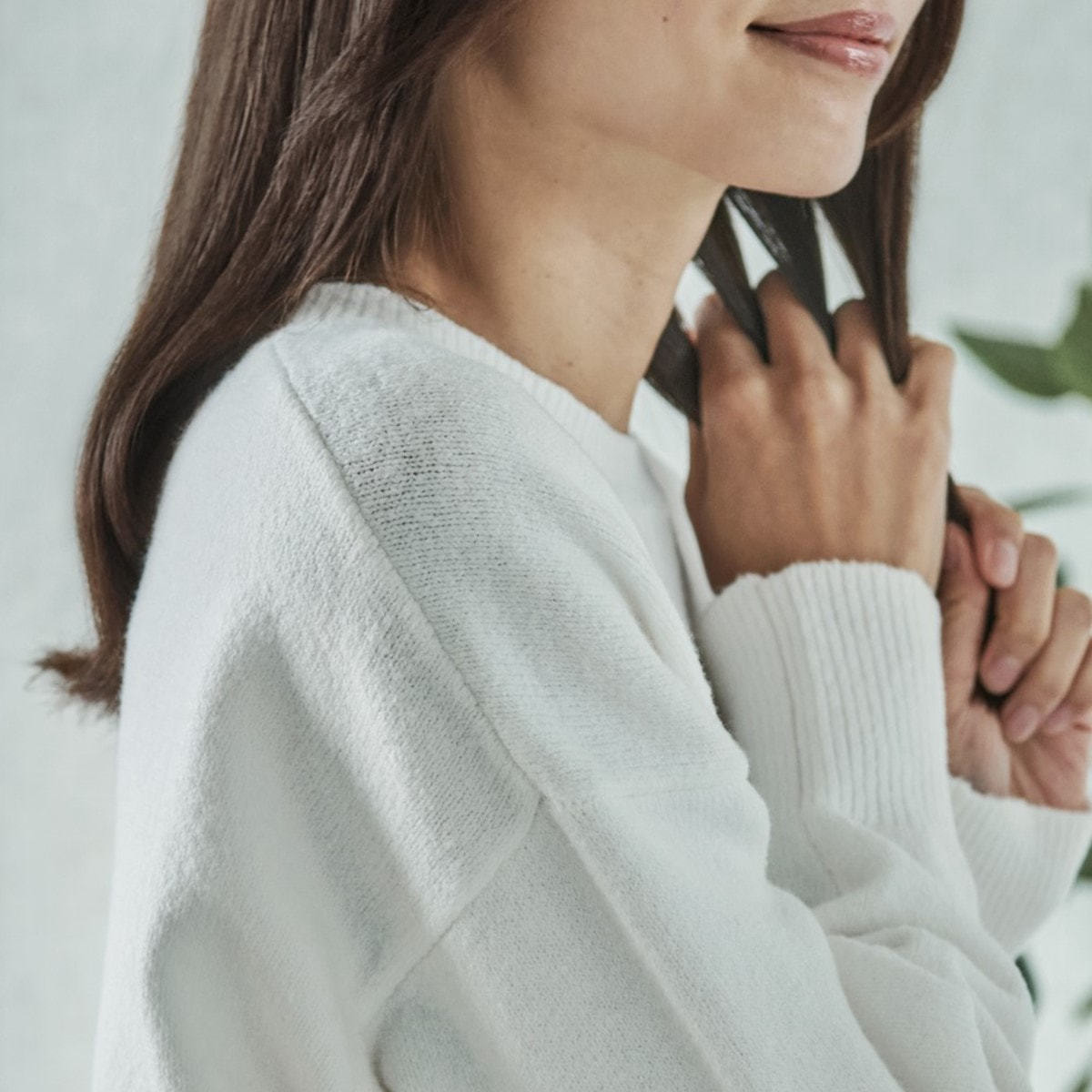 毛先を中心に手ぐしで溶かすように薄く均一になじませたら、残ったオイルで表面や前髪を整えます。