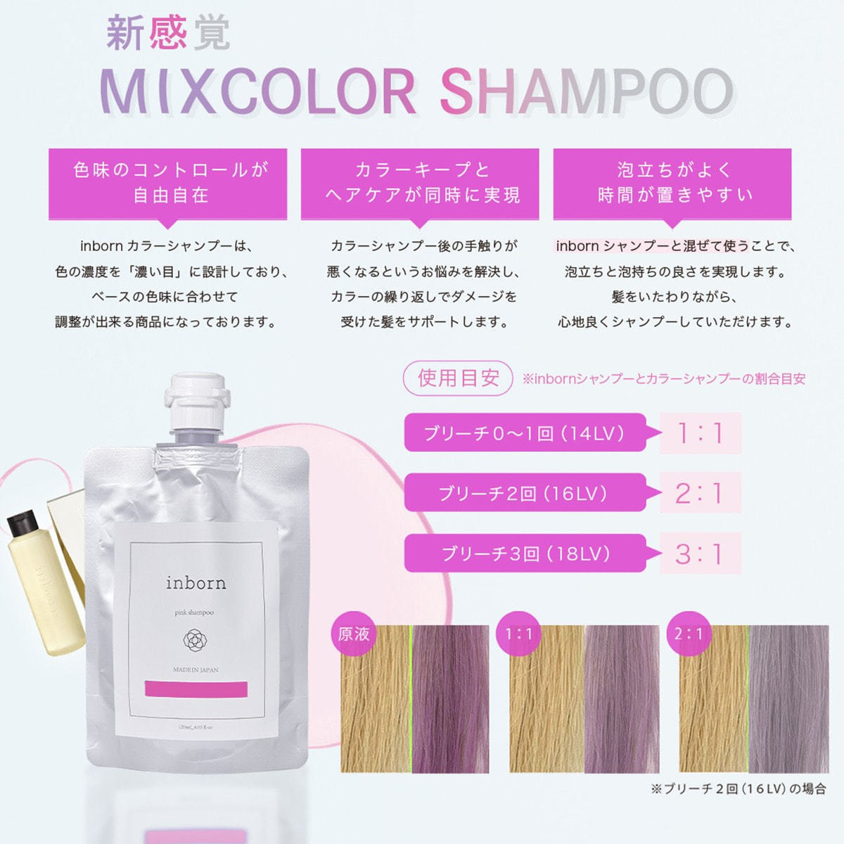 基本的に、「inbornシャンプー:カラーシャンプーを1:1」を目安としておりますが、ブリーチの回数や髪質に合わせて濃度を調整をすることをおすすめしています。