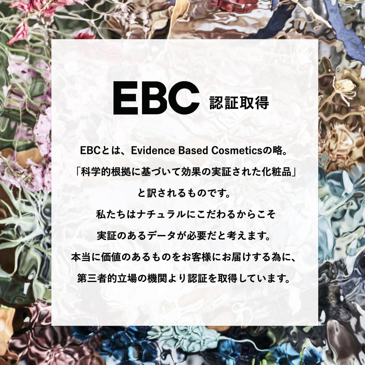 EBC認証取得:エビデンス濃度を配合。科学的根拠に基づいて効果の実証された化粧品として認証を受けています。